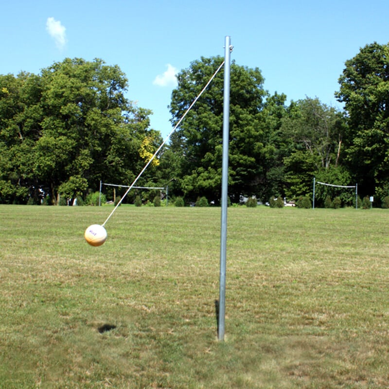 The Tetherball post can be set in an optional ground sleeve or concrete flooring to provide either a semi-permanent or permanent system. Overall post length of 11’6" (351 cm) provides for 18" (46 cm) of the Tetherball system to be set in concrete flooring or placed in an optional ground sleeve. Posts are constructed of 2-3/8" (60 mm) 13-gauge galvanized tubing. Top of post is capped to prevent collection of water or moisture. The Tetherball system also consists of a 5-ply yellow rubber covered ball with nylon wound butyl bladder, reinforced recessed rope attachment, and braided nylon rope. Notches on the bottom of post prevent rotation in footing and/or ground sleeve.