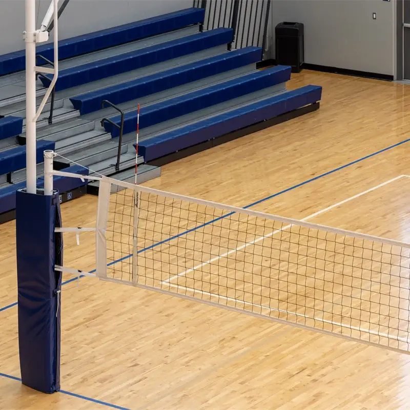 The Overhead Volleyball System stores at the ceiling with the net, antennas, boundary markers, and pads attached. It attaches to the roof structure with the same high strength tube and clamps used on our backstops to ensure a rigid design. Just turn the key switch to lower your volleyball system from the ceiling, set the stabilization feet, and you are ready for competition. Each vertical mast features an adjustable spherical shaped foot that protects your gym floor, while providing stable posts and maximum net tension. Vertical masts also include an adjustable volleyball post that incorporates a screw-rod style height adjustment mechanism. Net height is adjustable to all competition heights and anywhere in between.