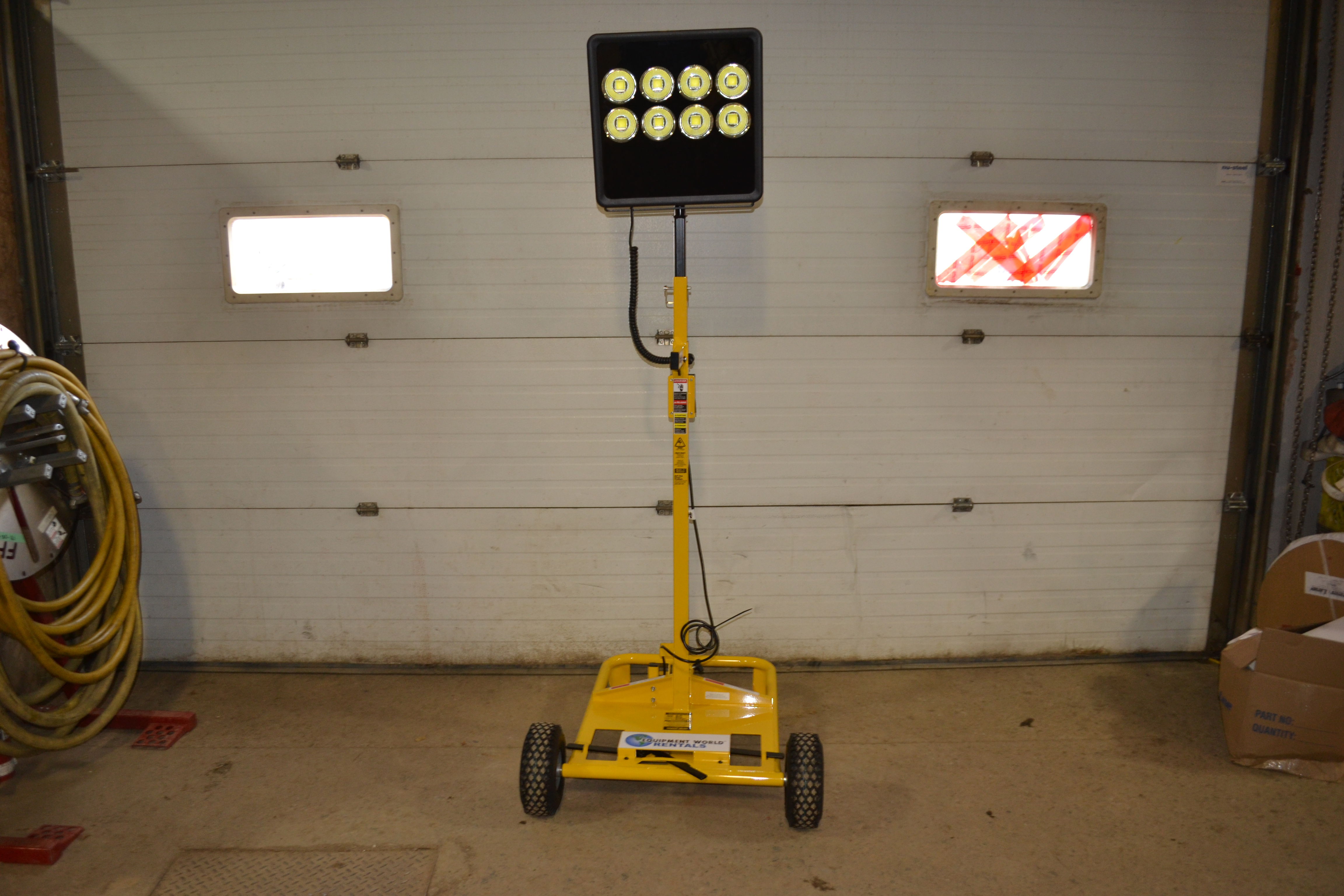 Eight powerful LED’s create more usable light than 1000W metal halide bulb and consume 70% less energy. Super bright LED provides 40,000 Lumens while lighting up to 100,000 sq. ft. Mast extends, from 6.5’ to 9’ overall height.