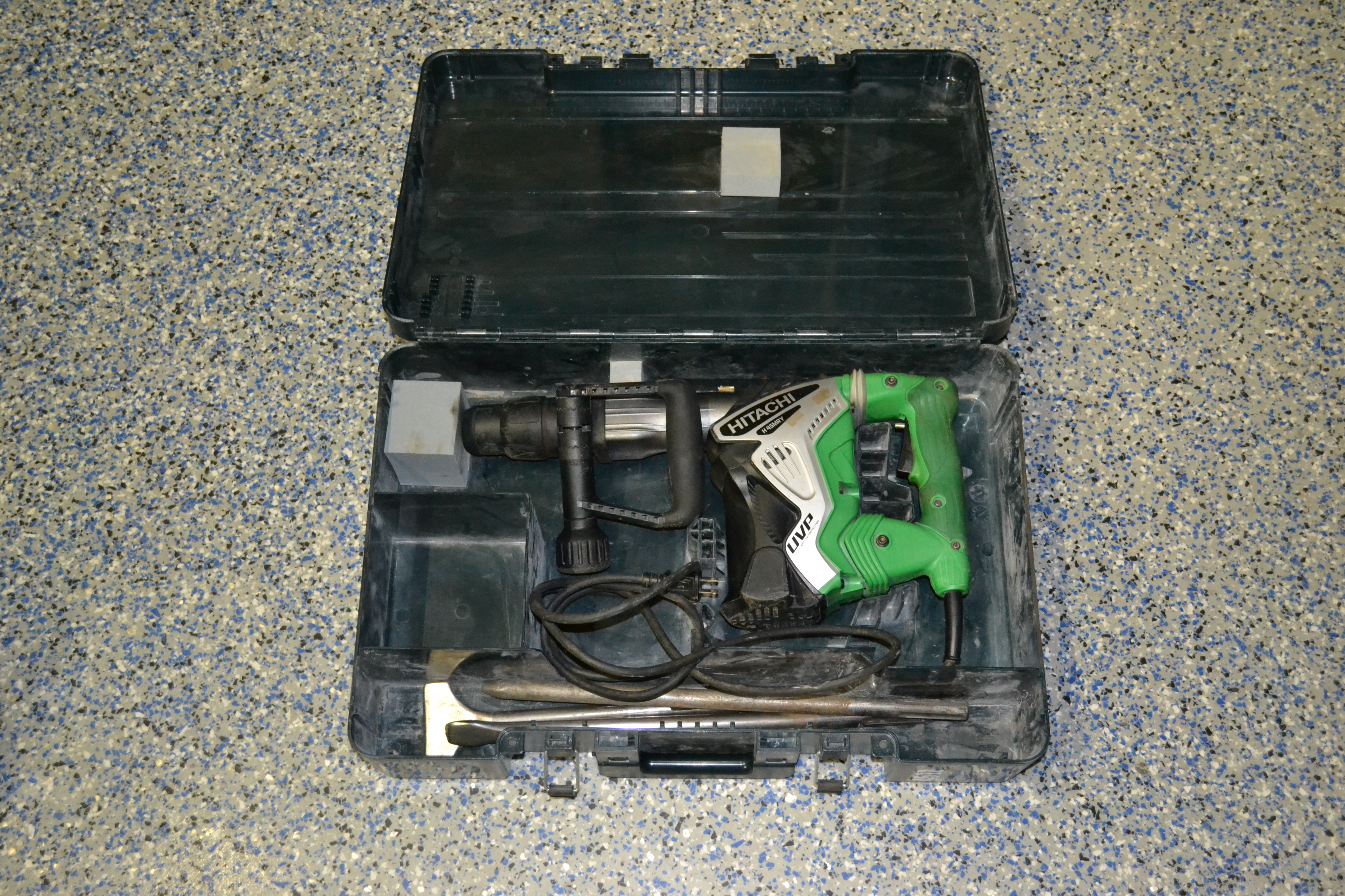 Black silver and green HITACHI domilition hammer.