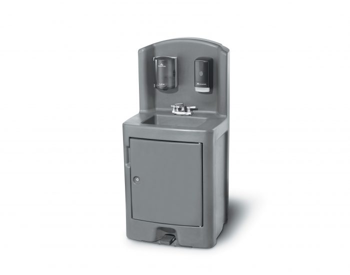 The Crown CV-PHS-5 portable hand washer adds sanitary on-site hand washing to any location within reach of an electrical outlet. DIMENSIONS 30" L X 27 3/8" W X 62" H/ DECK HEIGHT 38 1/8"/ FRESH WATER CAPACITY 5 gal/ WASTE WATER CAPACITY 7.5 gal/ WEIGHT 110 lbs/ SHIPPING WEIGHT 180 lbs.