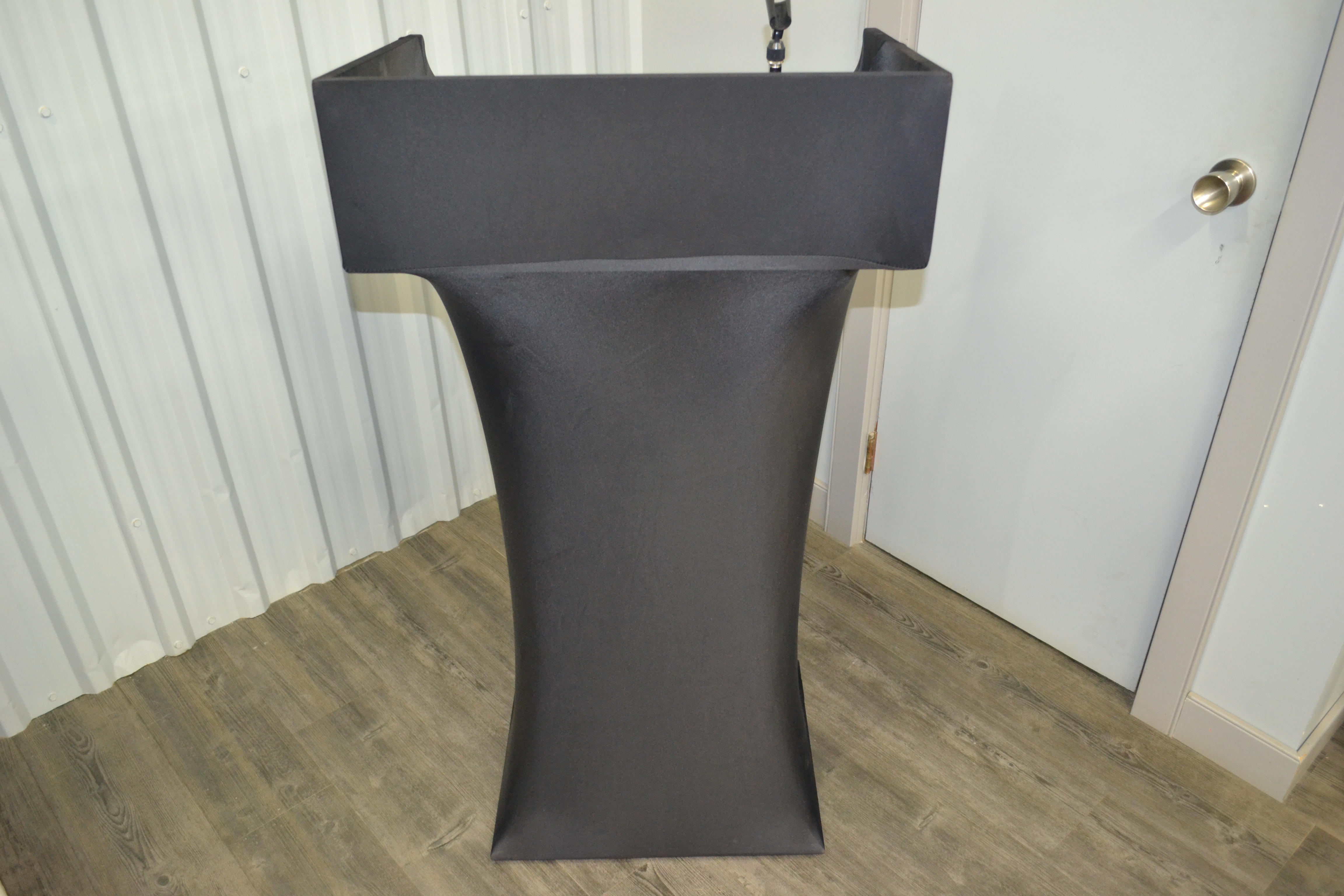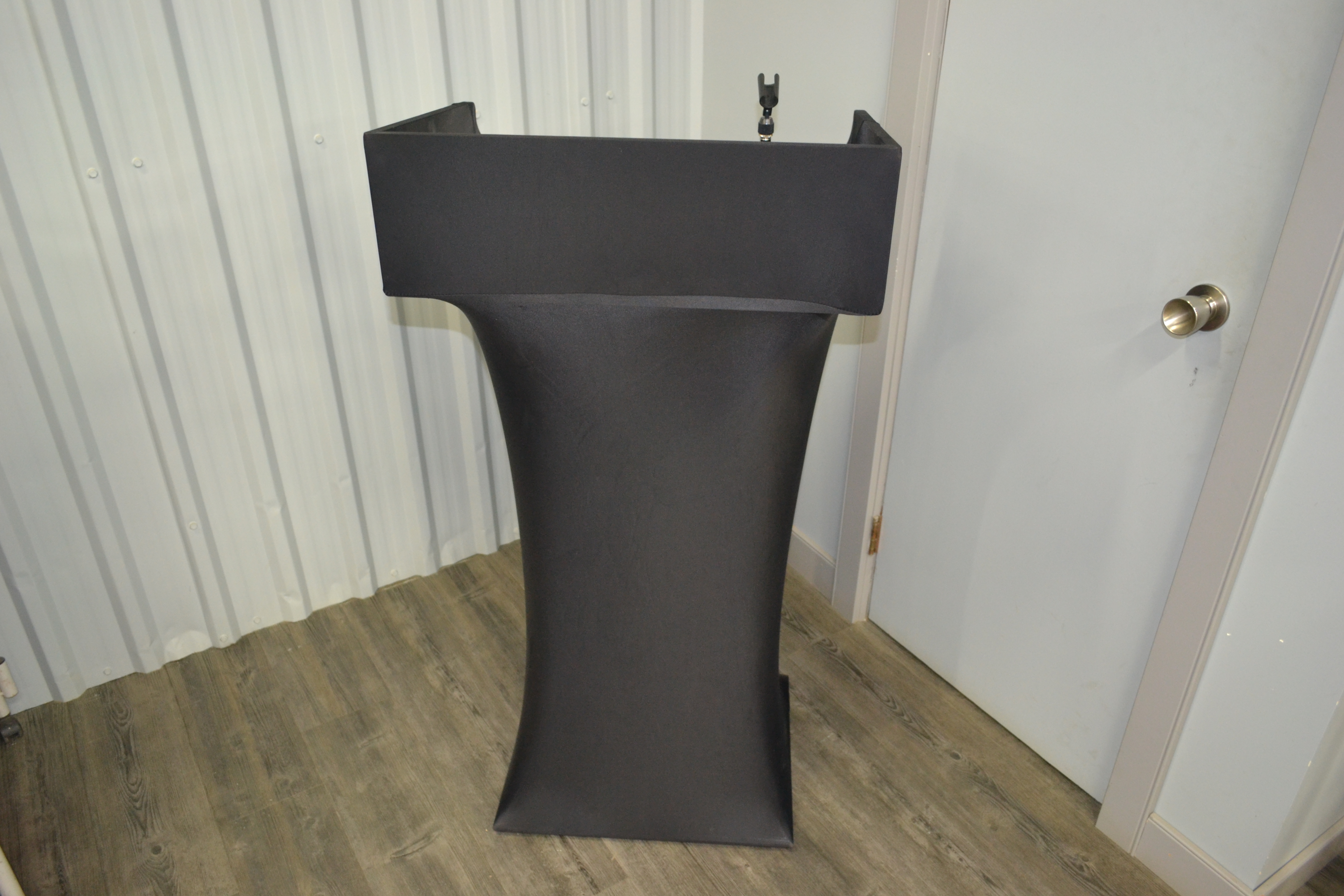 A bit more of a modern style podium made of metal and wood painted black.