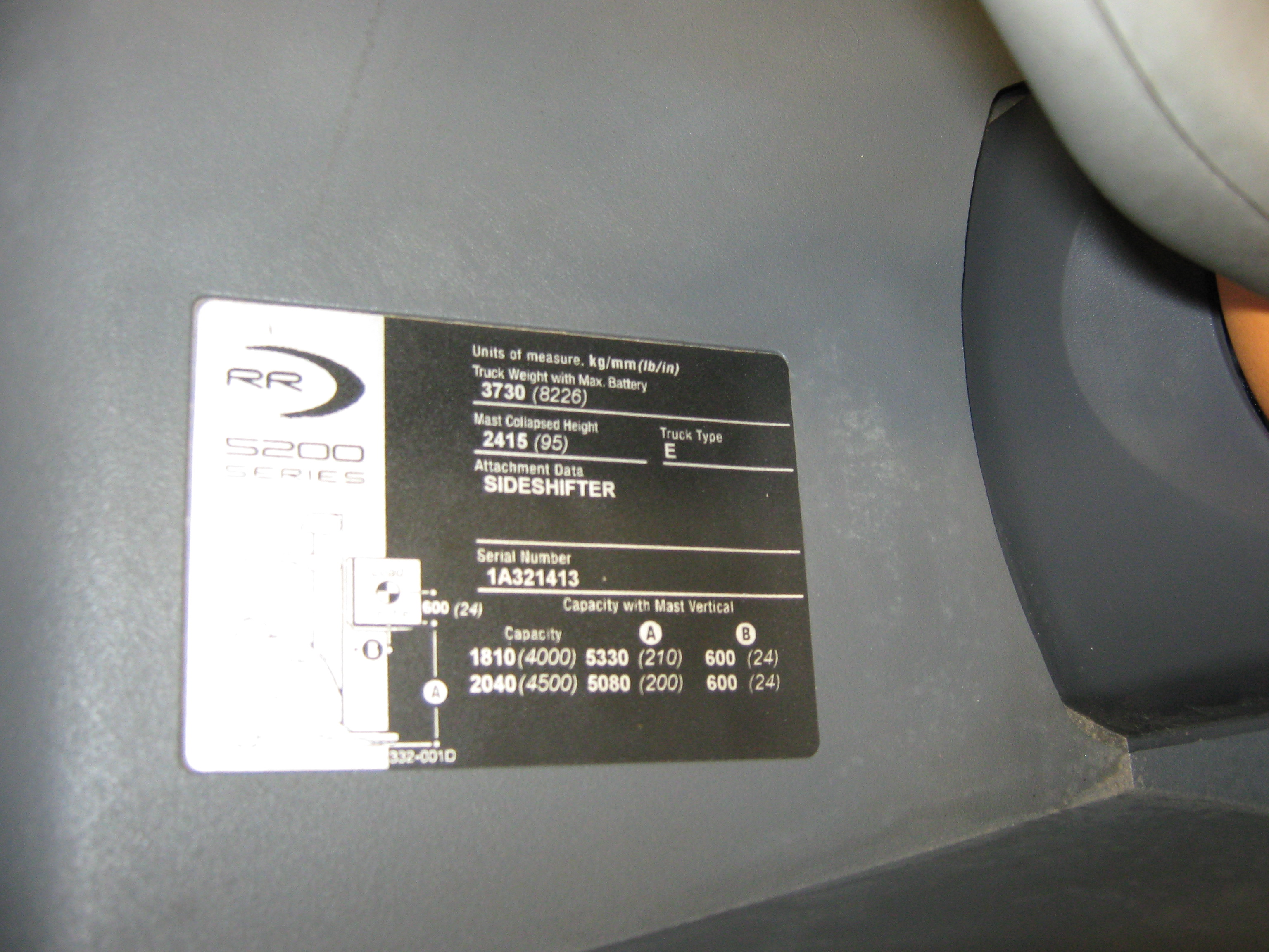 95" - 210" Mast ht./ 36V / 42" Forks/ Sideshift/ Capacity: 4000# -210"/ 4500#-200" Also available: Ametek 600M1-18G Charger S/N 314CS23849 - Price extra
