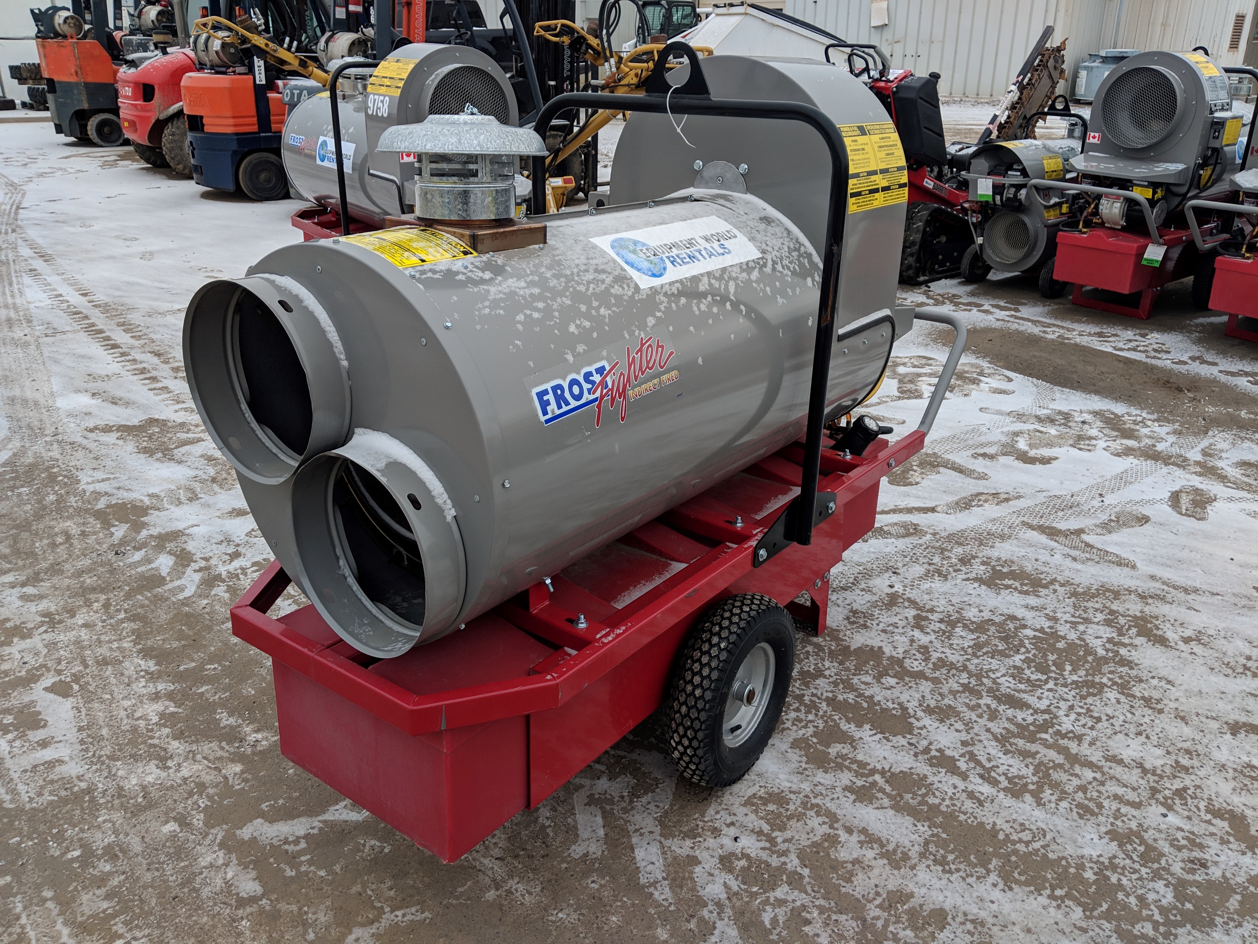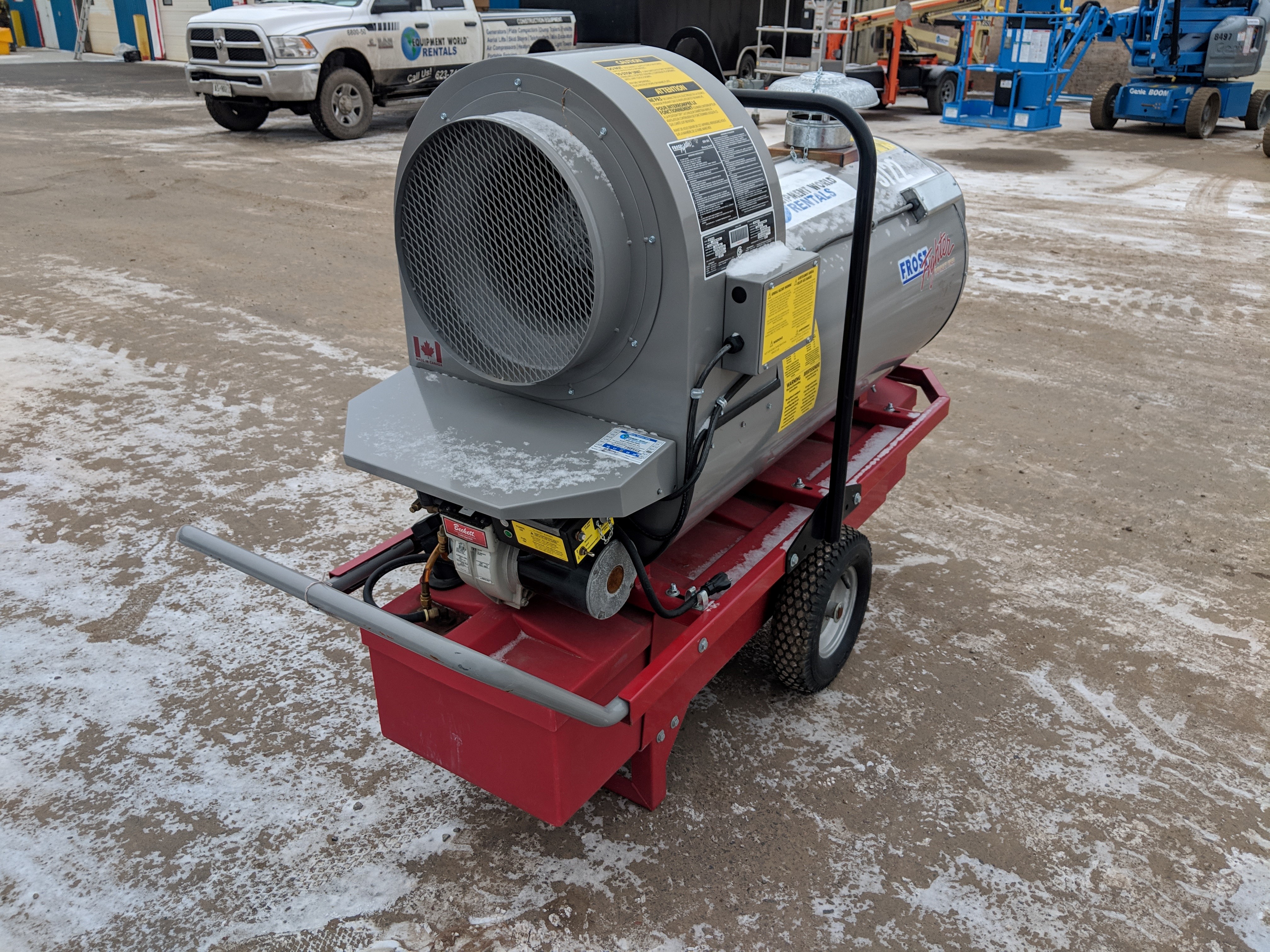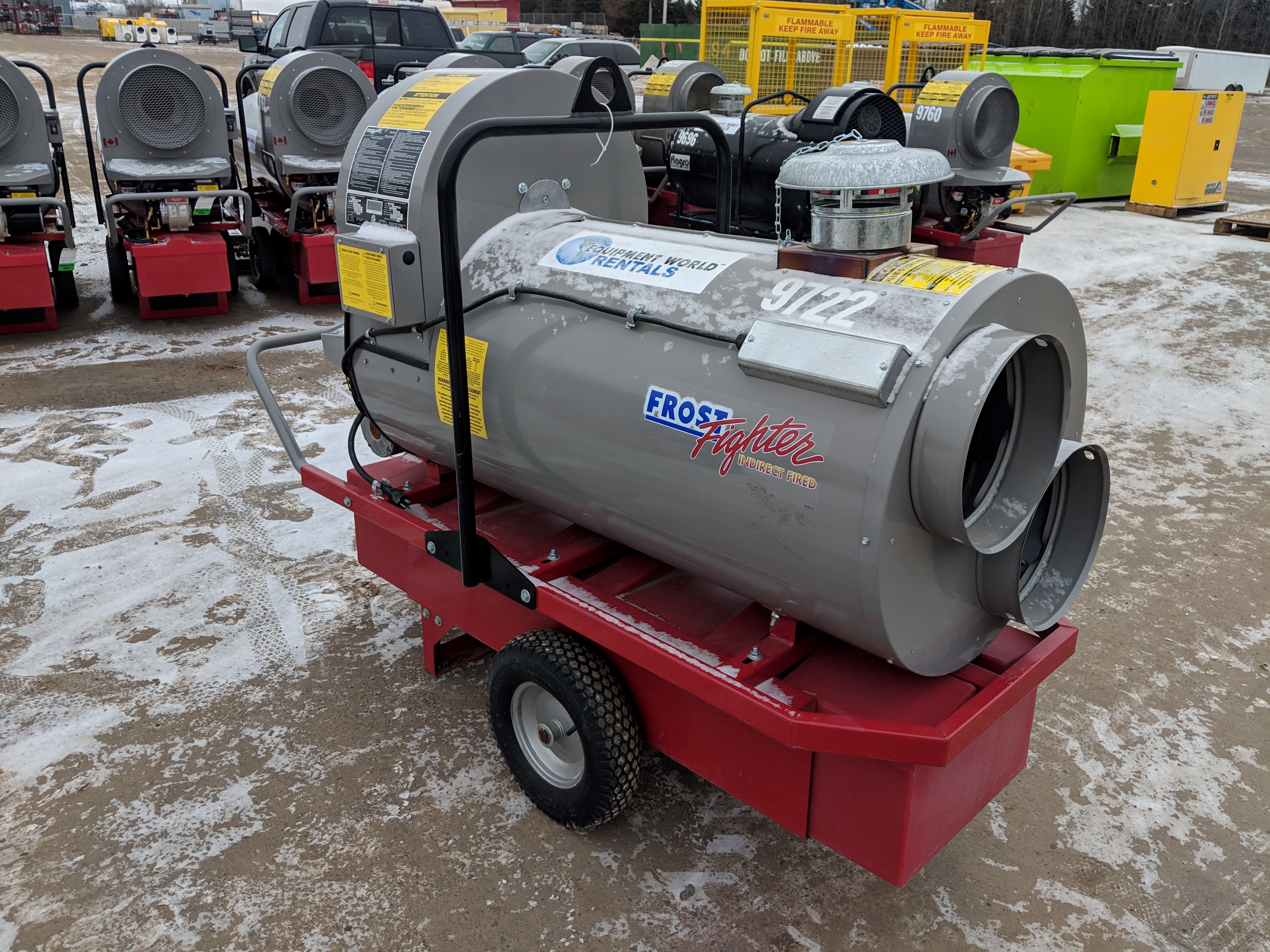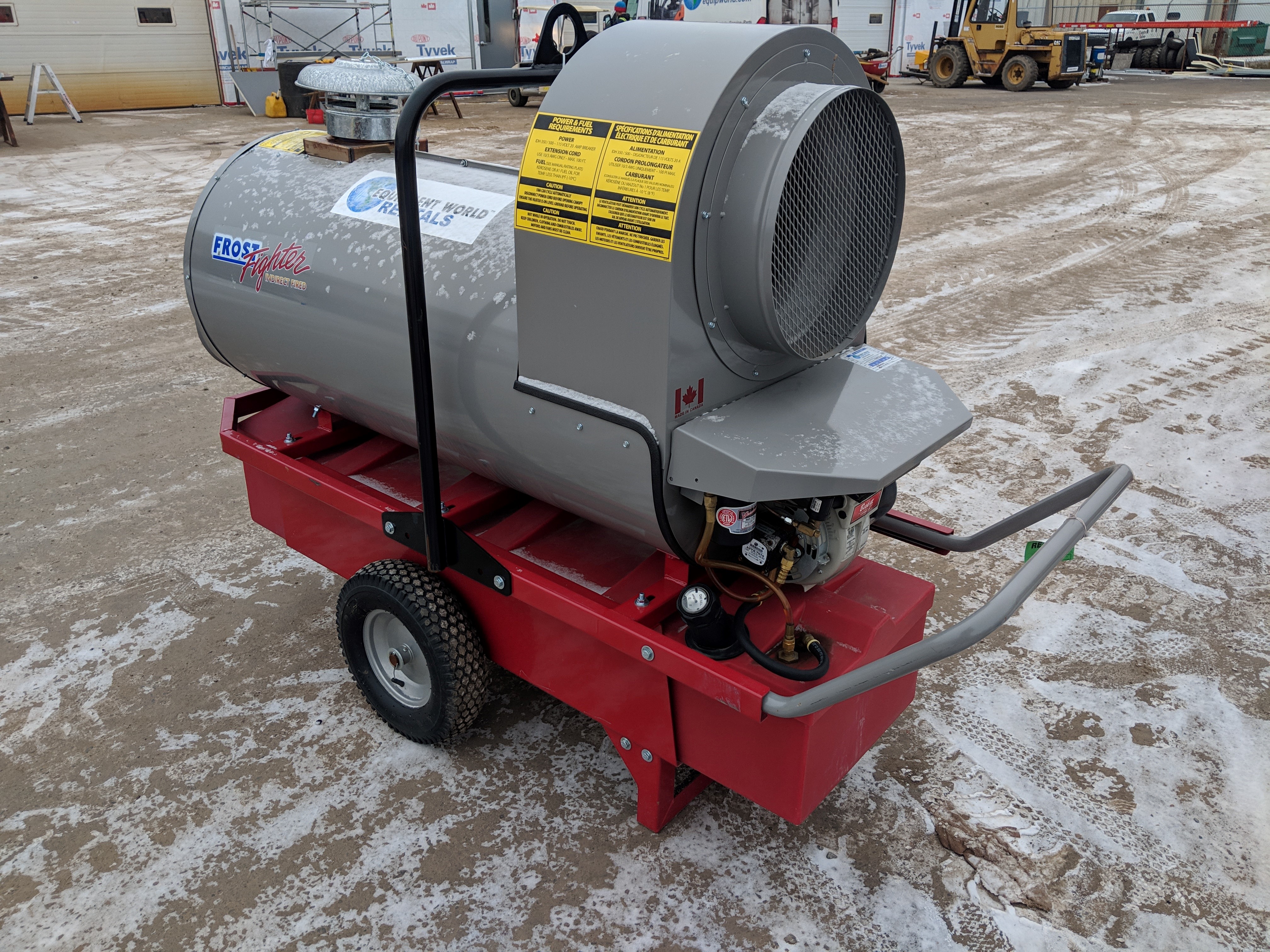 500,000 BTU / Diesel/Oil/ Power Requirement: 120V-20Amp / Std. Recirculation Pkg./ (3) 12" x 12' Ducts/ (1) 16" x 25' Yellow Return Duct/ Thermostat w/ 25' cord/ 3' Flue w/ Rain Cap