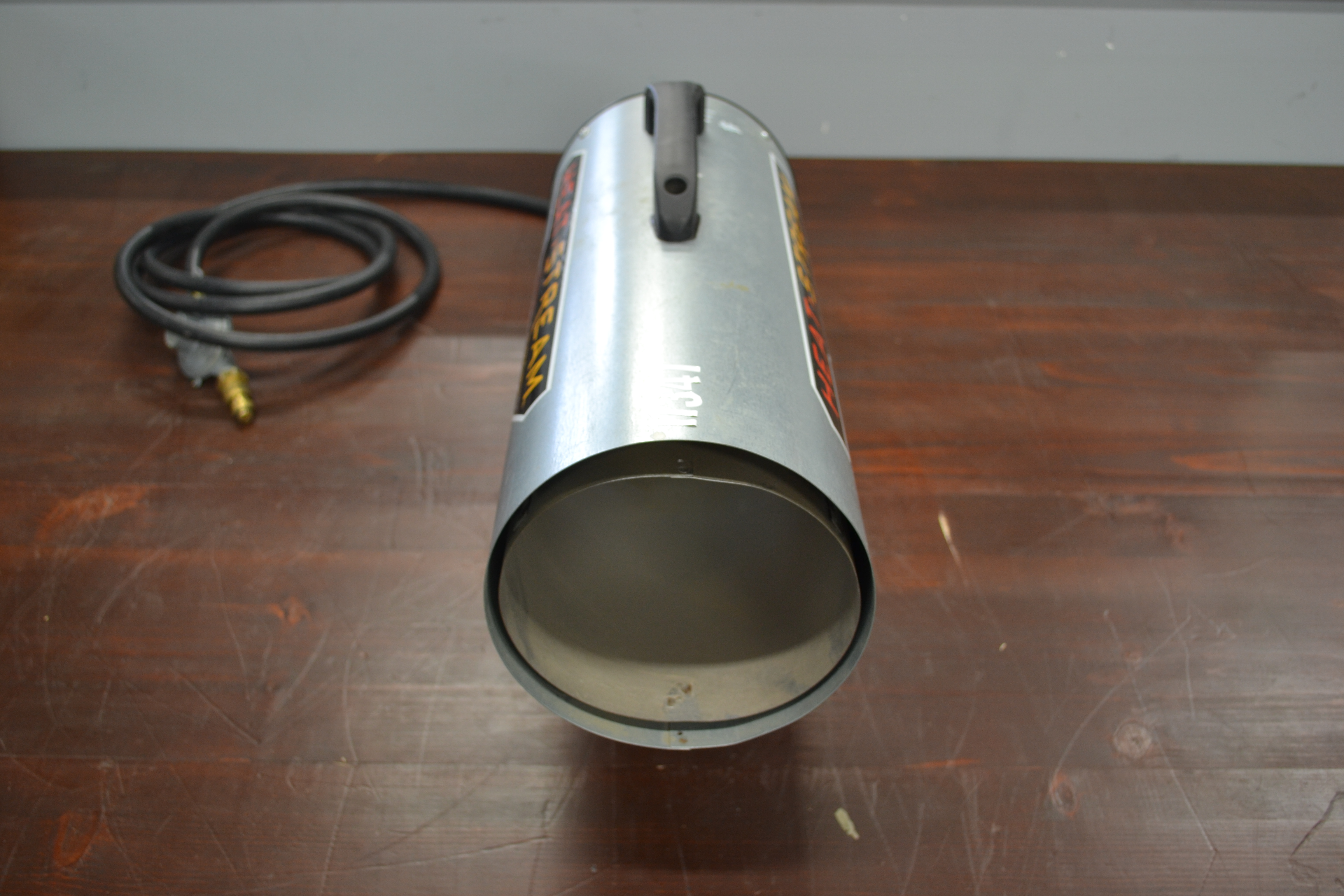 Cylindrical Silver and black heater with a handle on the top.