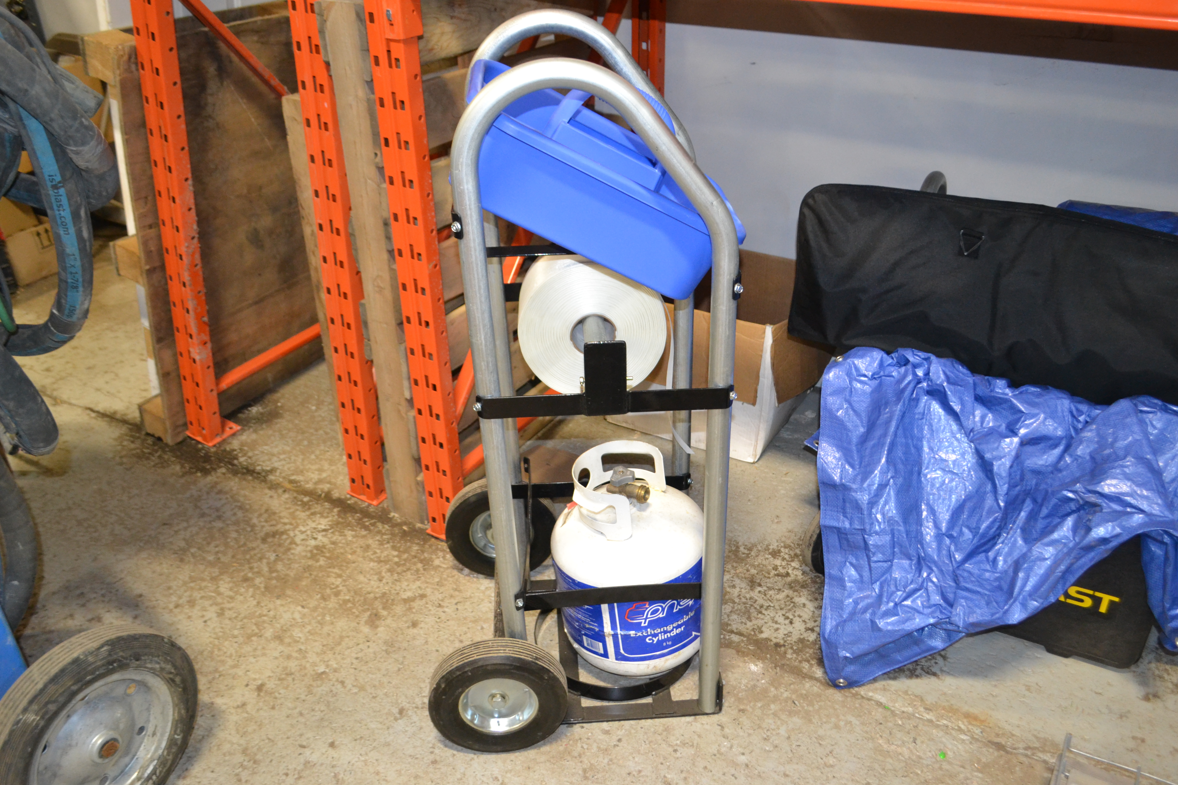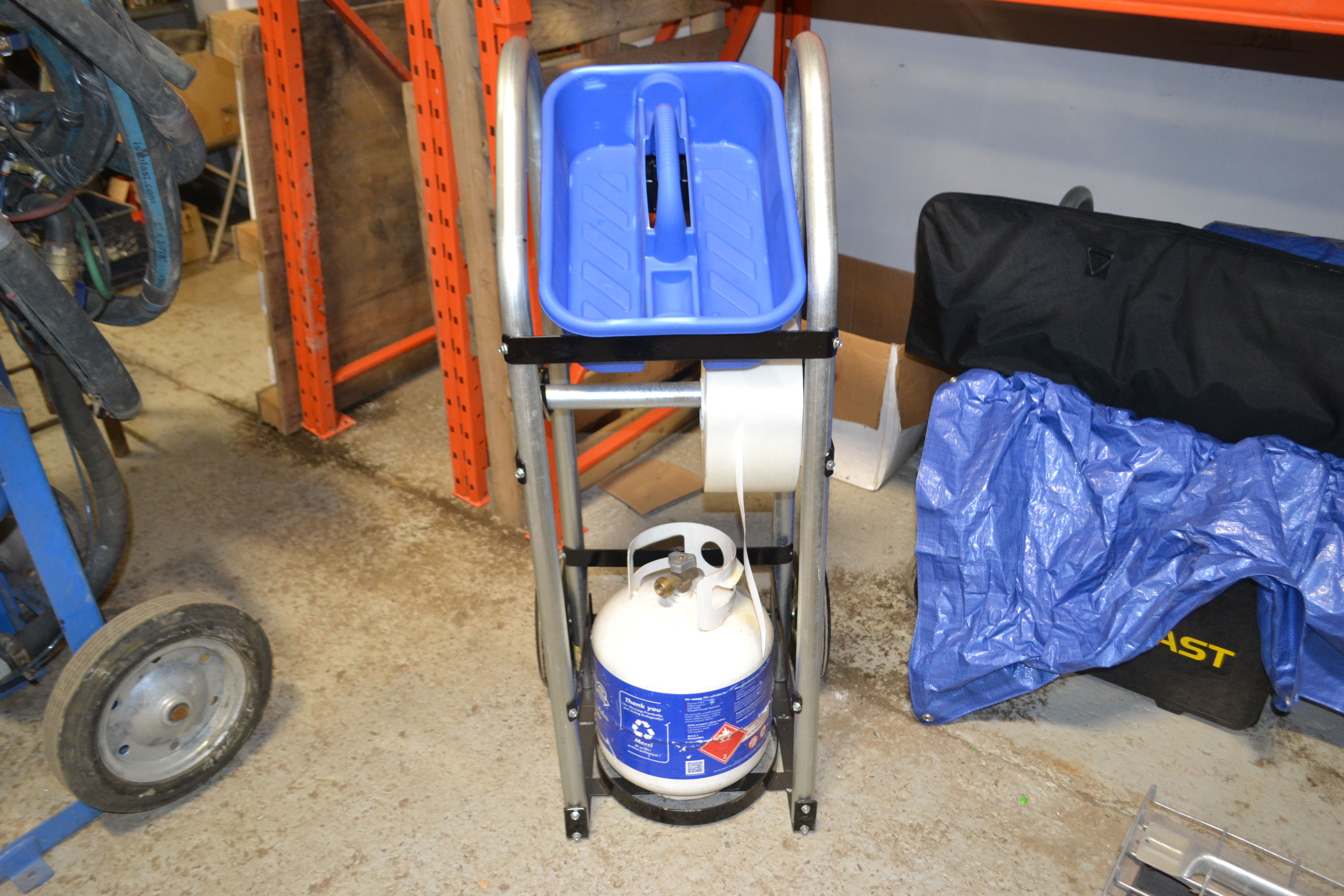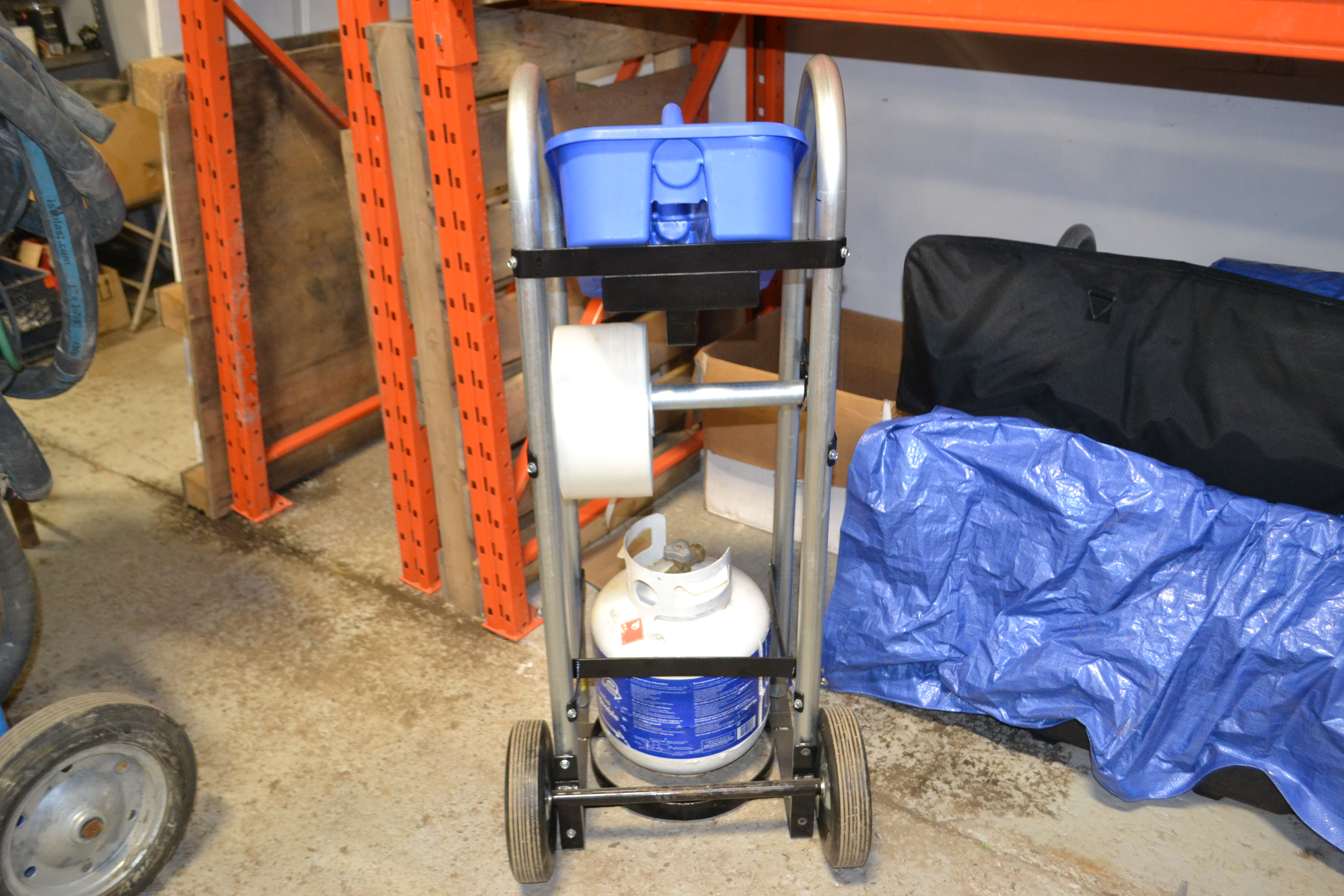 Lightweight two-wheeled Utility Cart with a spot for everything. Holds the propane tank, heat tool, hose, strapping, tape, buckles, etc. Rolls easily on 8” wheels. It will make you more efficient.