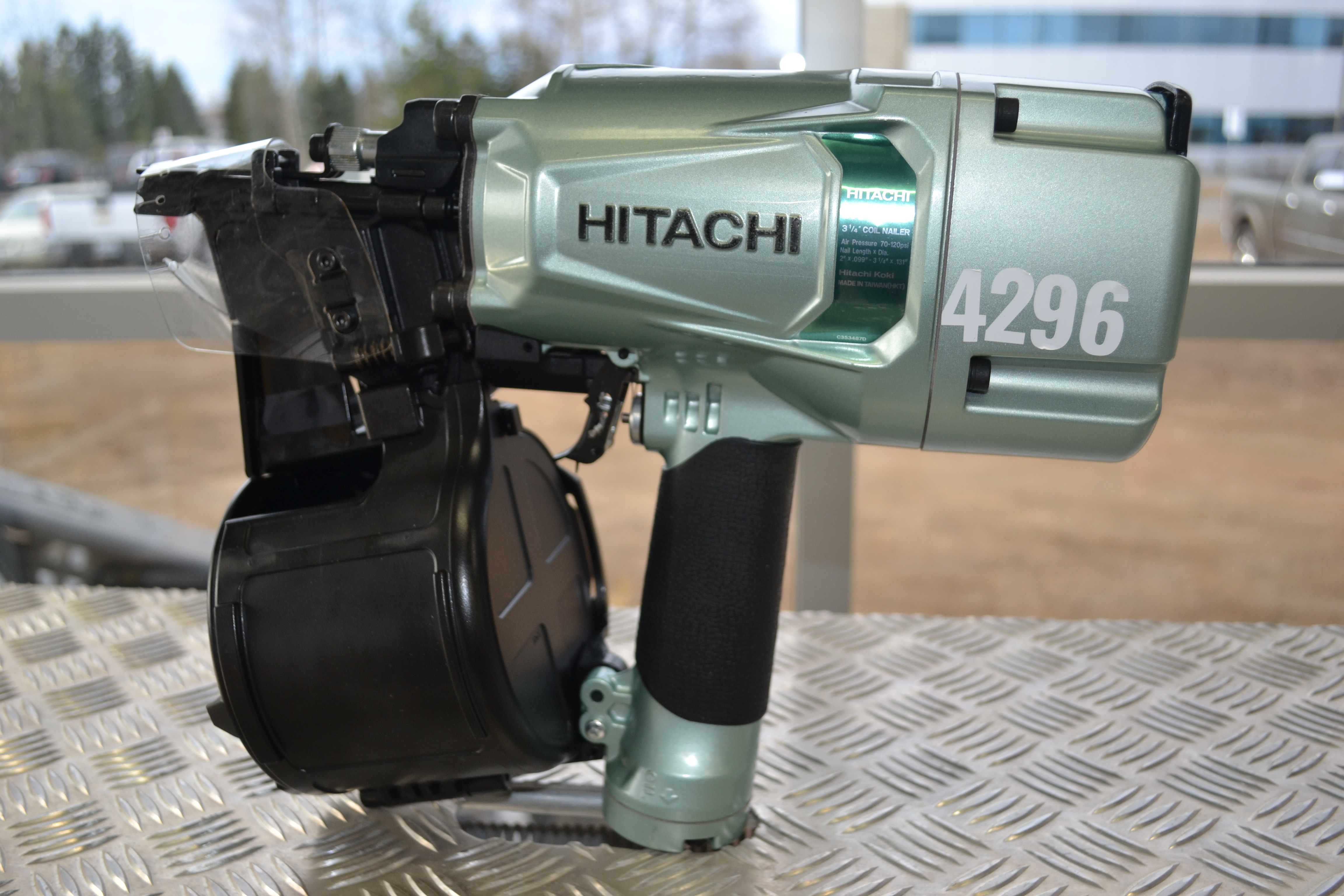 3 - 1/4" 83mm Hitachi air coil nailer with rafter hook and 70 - 120 psi operating pressure.
